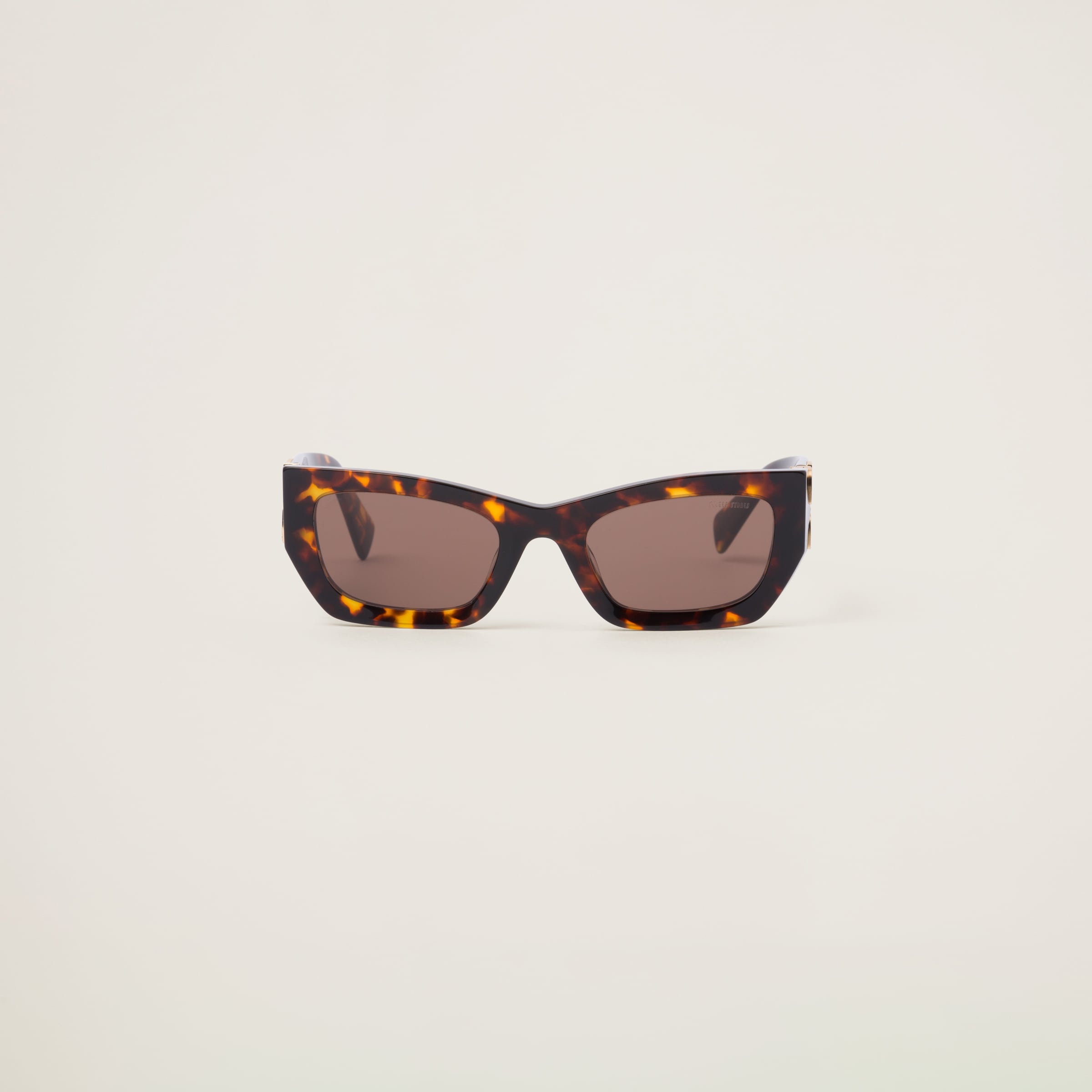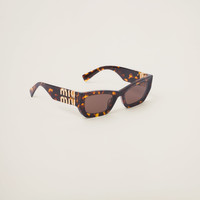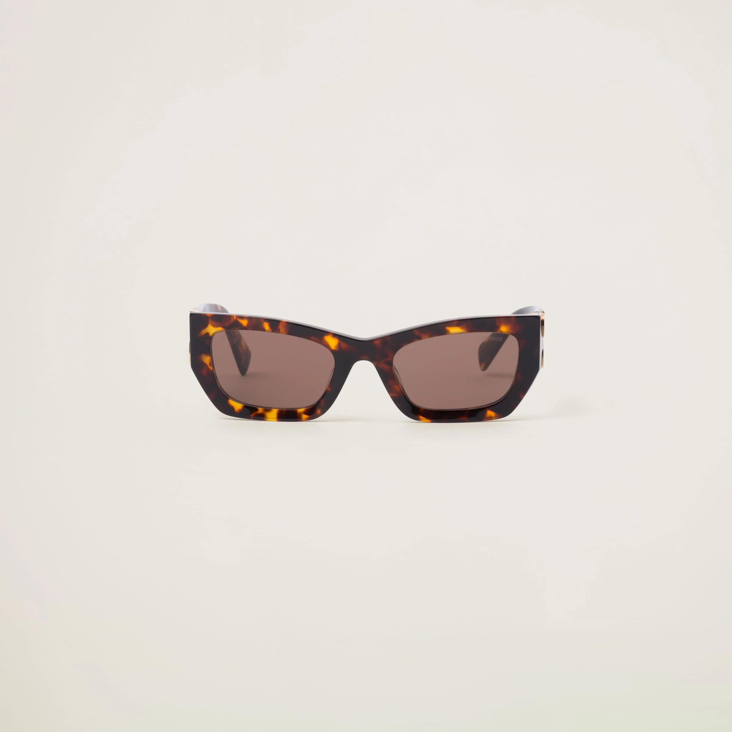 These rectangular acetate sunglasses with a bold design interpret rebellious femininity. The distinctive low profile frame front is accented with the new Miu Miu vertical logo integrated in the hinge of the thick temples. - Product code: SMU09W_EVAU_FE06B_C_053 - Acetate frame front in honey tortoiseshell - Frame not compatible with graduated lenses - 100% UVA / UVB protection - Full fit - Lens-nose-temple measurement: 53-22-135 mm - Article comes with dedicated packaging - Other available colors - Imported
