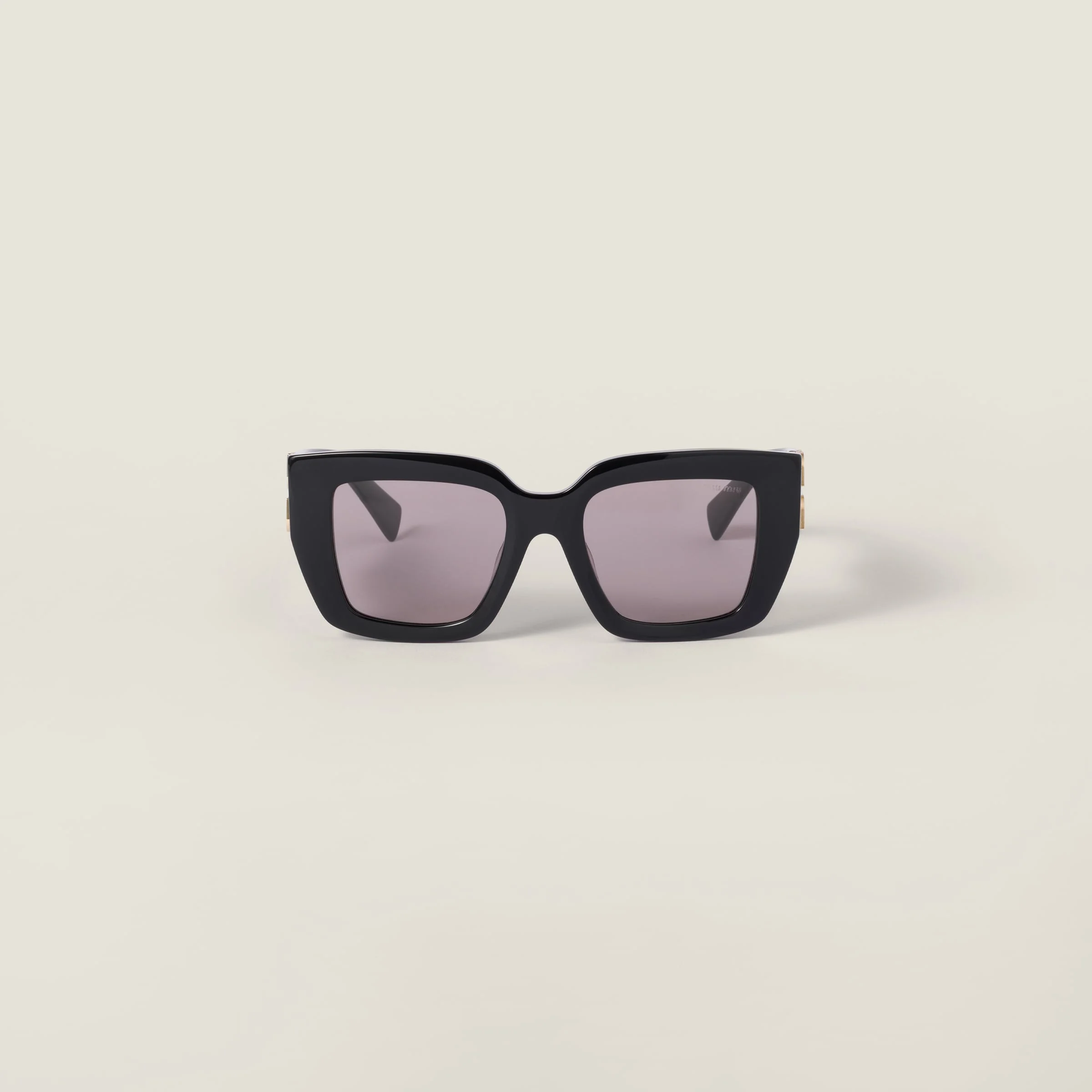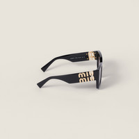 The Miu Glimpse sunglasses reinterpret the collection’s stylistic codes with low-set shapes and streamlined profiles. The rectangular acetate frame is highlighted by the vertical Miu Miu logo integrated into the hinge of the thick temples. - Product code: SMUB05_E16K_FE20I_C_051 - Acetate frame front - recycled black color - Frame compatible with graduated lenses - 100% UVA/UVB protection - Standard Fit - Lens-nose-temple measurement: 51-21-135 mm - Article comes with dedicated packaging - Imported Materials Main material: Acetate