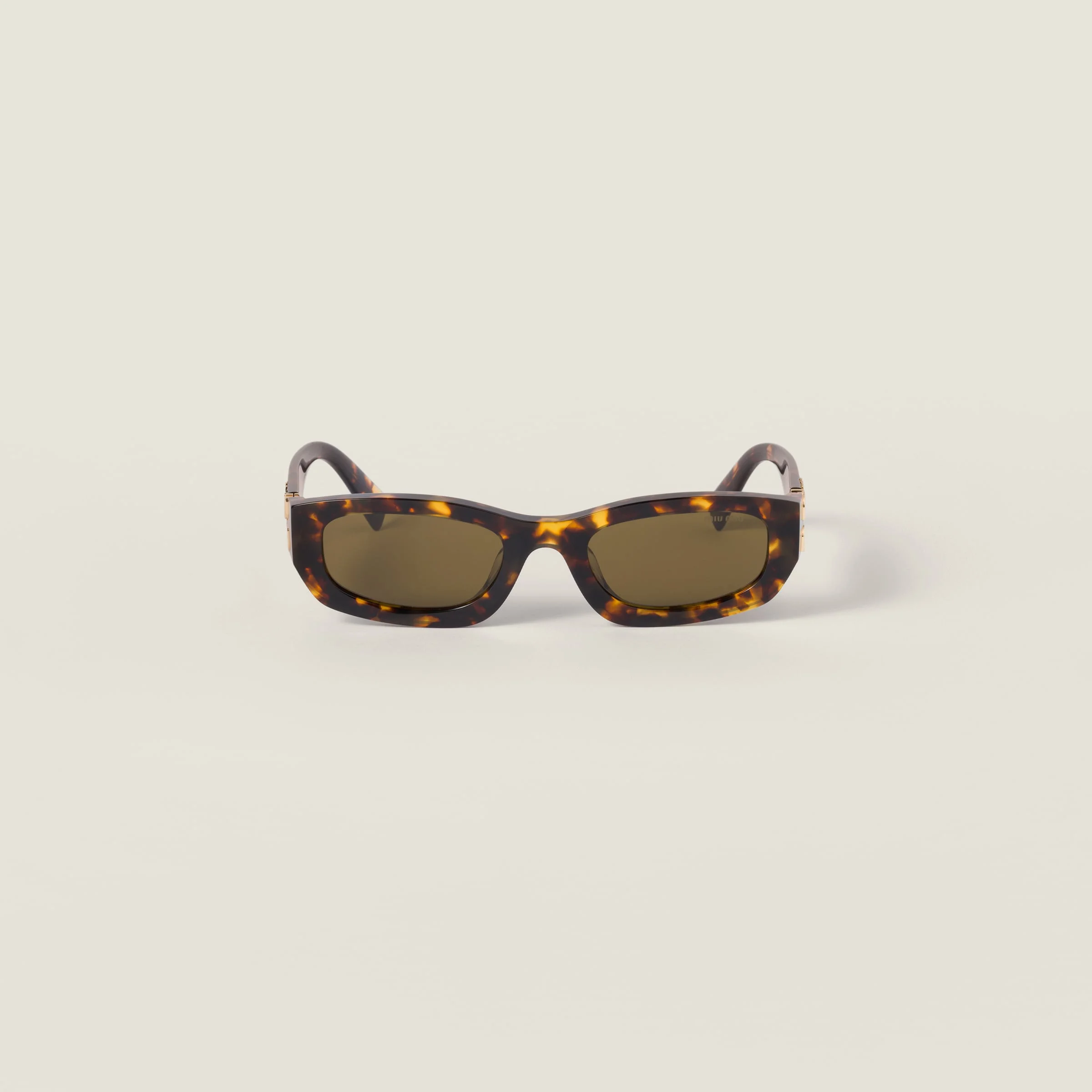 The Miu Glimpse sunglasses reinterpret the collection’s stylistic codes with low-set shapes and streamlined profiles. The rectangular acetate frame is highlighted by the vertical Miu Miu logo integrated into the hinge of the thick temples. - Product code: SMUB04_E14L_FE09Z_C_053 - Acetate frame front - recycled honey tortoise color - Frame compatible with graduated lenses - 100% UVA/UVB protection - Standard Fit - Lens-nose-temple measurement: 53-22-135 mm - Article comes with dedicated packaging - Imported Materials Main material: Acetate