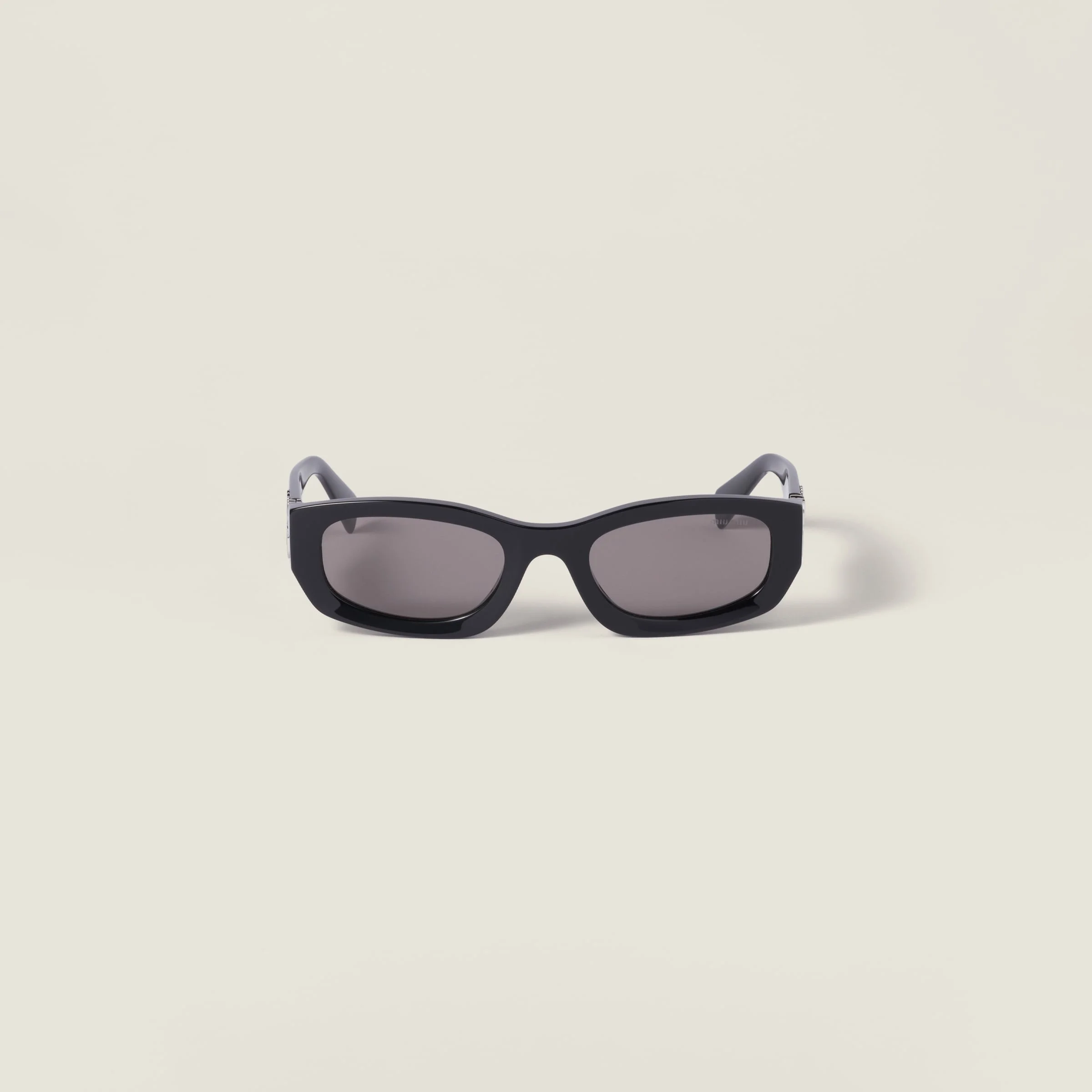 The Miu Glimpse sunglasses reinterpret the collection’s stylistic codes with low-set shapes and streamlined profiles. The rectangular acetate frame is highlighted by the vertical Miu Miu logo integrated into the hinge of the thick temples. - Product code: SMUB04_E16K_FE80Q_C_053 - Acetate frame front - recycled black color - Frame compatible with graduated lenses - 100% UVA/UVB protection - Standard Fit - Lens-nose-temple measurement: 53-22-135 mm - Article comes with dedicated packaging - Imported Materials Main material: Acetate