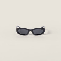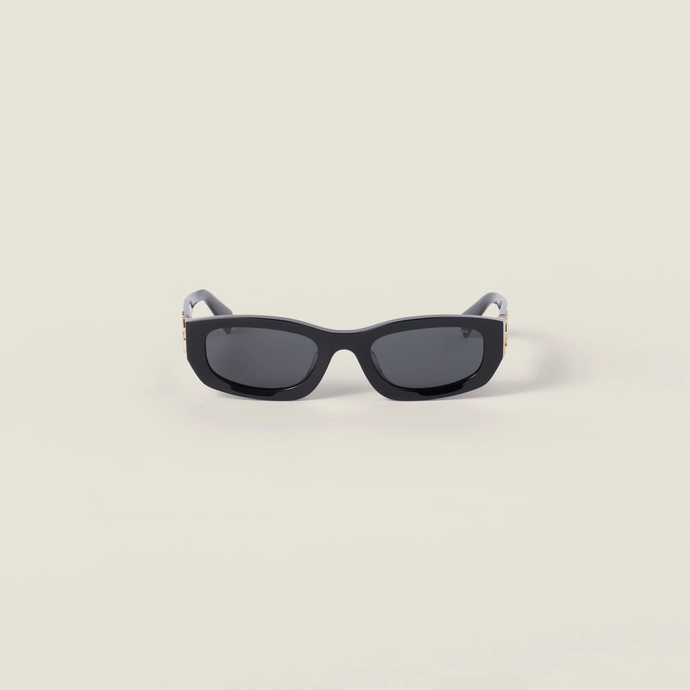 The Miu Glimpse sunglasses reinterpret the collection’s stylistic codes with low-set shapes and streamlined profiles. The rectangular acetate frame is highlighted by the vertical Miu Miu logo integrated into the hinge of the thick temples. - Product code: SMUB04_E16K_FE08Z_C_053 - Acetate frame front - recycled black color - Frame compatible with graduated lenses - 100% UVA/UVB protection - Standard Fit - Lens-nose-temple measurement: 53-22-135 mm - Article comes with dedicated packaging - Imported Materials Main material: Acetate