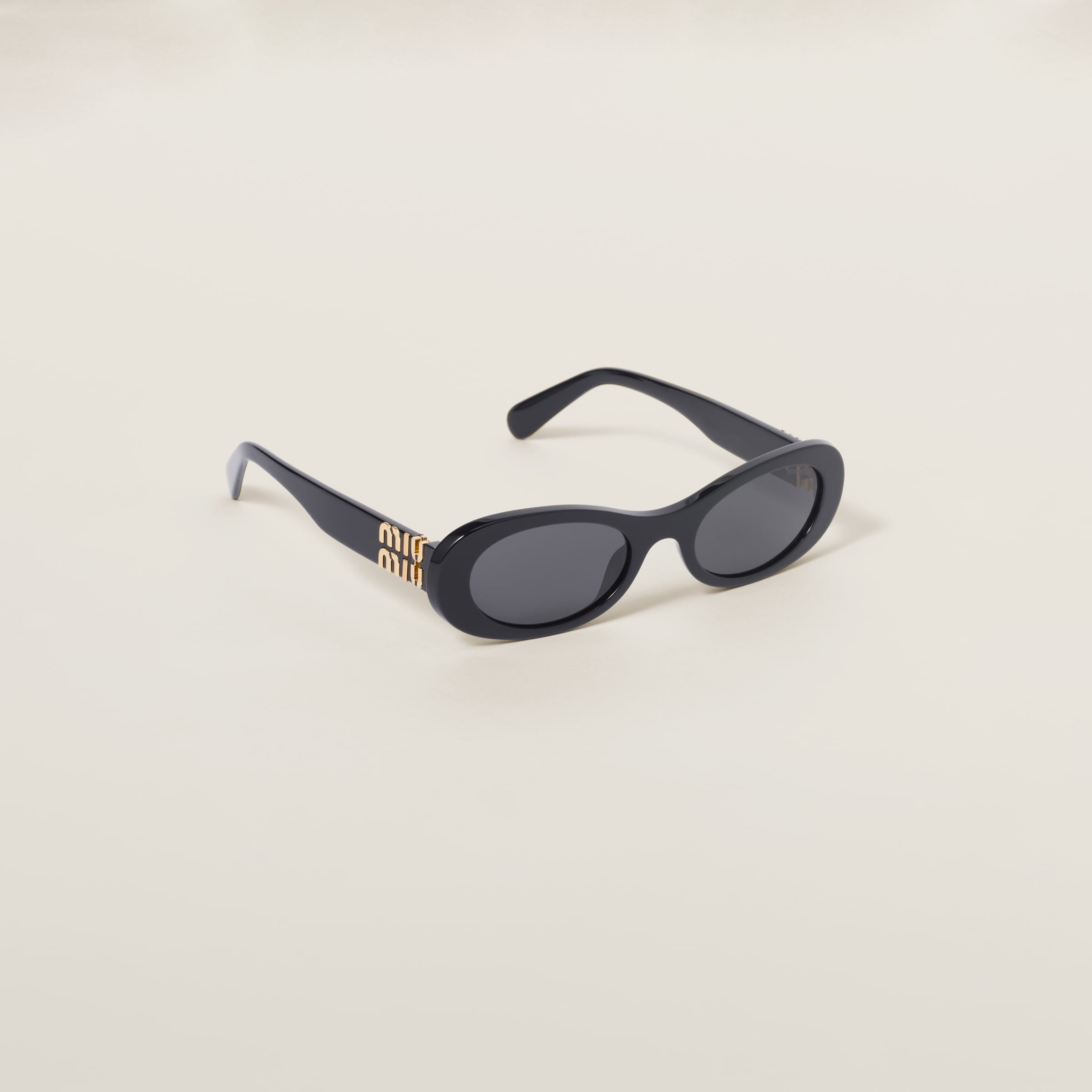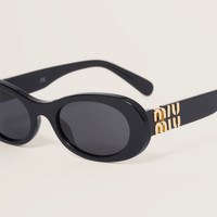 Acetate sunglasses with a soft oval design that expresses sophisticated femininity. The narrow silhouette of the frame front is enhanced by the vertical Miu Miu logo integrated into the hinge of the temples. - Product code: SMU06Z_E1AB_F05S0_C_050 - Acetate frame front - Color: Black - Frame compatible with graduated lenses - 100% UVA / UVB protection - Standard fit - Lens-nose-temple measurement: 50-20-140 mm - Article comes with dedicated packaging - Other available colors - Imported