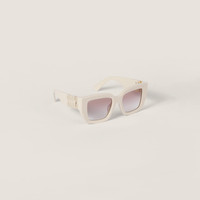 The Miu Glimpse sunglasses reinterpret the collection’s stylistic codes with low-set shapes and streamlined profiles. The rectangular acetate frame is highlighted by the vertical Miu Miu logo integrated into the hinge of the thick temples. - Product code: SMUB05_E21D_FE90L_C_051 - Acetate frame front - recycled bio milk white color - Frame compatible with graduated lenses - 100% UVA/UVB protection - Standard Fit - Lens-nose-temple measurement: 51-21-135 mm - Article comes with dedicated packaging - Imported Materials Main material: Acetate