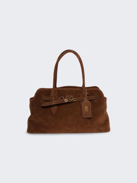 Details - Suede Aventure shoulder bag - Snap hook closure - Suede handles for shoulder carry - Removable leather trick - Gold-tone hardware - Purse feet - Cotton lining with zipper pocket and patch pocket - Embossed lettering logo on the front - Material: Calfskin Leather Size Information: Vendor Color Code: Brand Style: 5BG310 V OOO 2CSS Designer/Brand: MIU MIU