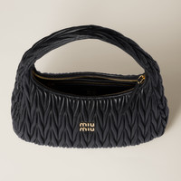 The Wander bag is reinterpreted season after season, becoming an iconic accessory of Miu Miu collections. Made of matelasse nappa leather, the bag is characterized by the sophisticated, three-dimensional effect created by the refined workmanship. The hobo shape, blending retro inspirations and contemporary elegance, becomes a new synonym of modern femininity. - Product code: 5BC170_N88_F0002_V_OOO - Matelasse motif - Gold-tone hardware - Zipper closure - Cotton satin lining with zipper pocket - Metal lettering logo on the front - Imported Height 27cm Width 35cm Length 4.5cm Materials Main material: Lambskin