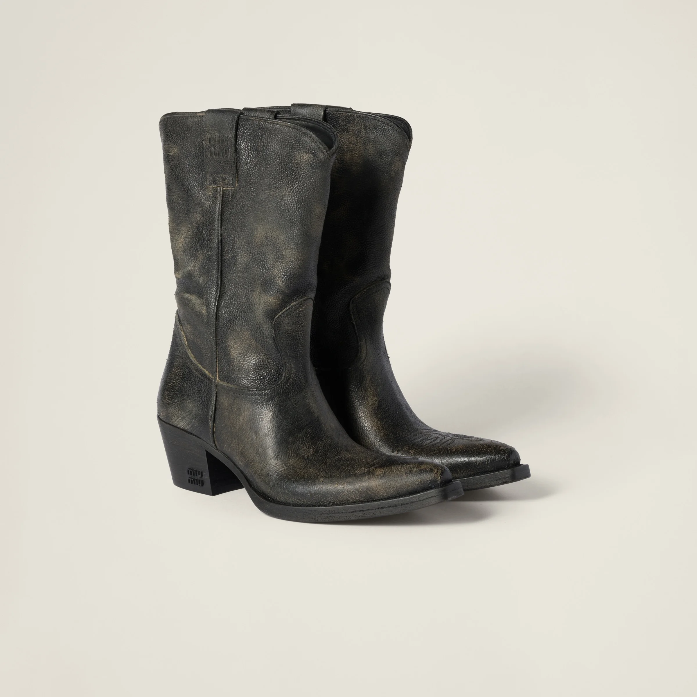 The vintage effect of the leather defines these Texan boots, which are inspired by classic men's wardrobe, combining them with preppy and feminine elements. - Product code: 5U349E_2KJ_F0324_F_045 - 25 cm high leg - 45 mm leather covered heel - Leather lining - Leather and rubber sole with metal lettering logo on the heel - Leather insoles - Logo embossed on tie rods - Imported Materials Main material: Calfskin