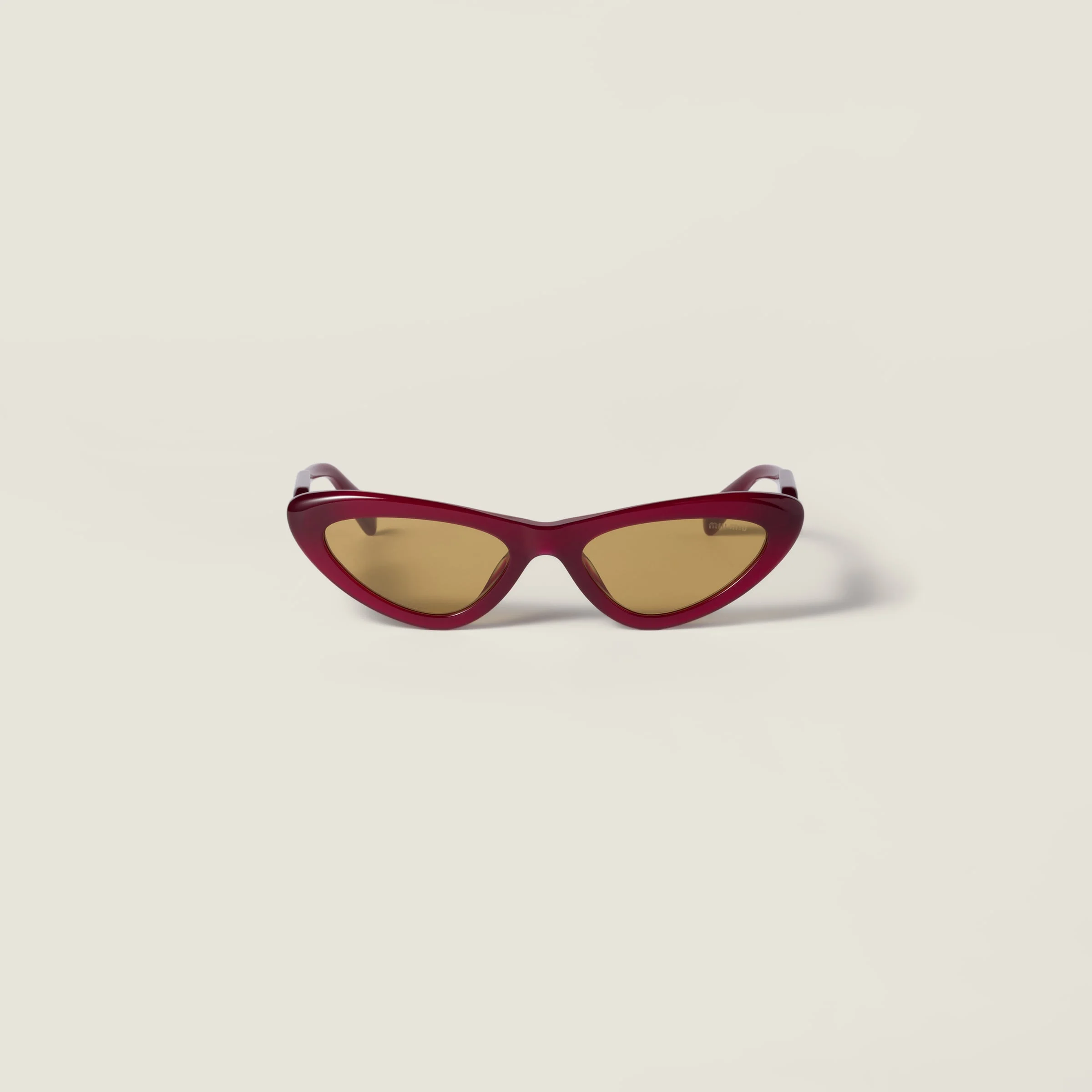 Acetate sunglasses with a sophisticated attitude. The softly curved front features a distinctive cat-eye shape and is combined with flat temples decorated with the vertical Miu Miu logo that taper naturally towards the tip. - Product code: SMUB11_E21I_FE10Y_C_U055 - Acetate frame front - Color: Opaline Crimson - Frame compatible with graduated lenses - 100% UVA / UVB protection - Full Fitting - Lens-nose-temple measurement: 55-19-140 mm - Article comes with dedicated packaging - Imported Materials Main material: Acetate