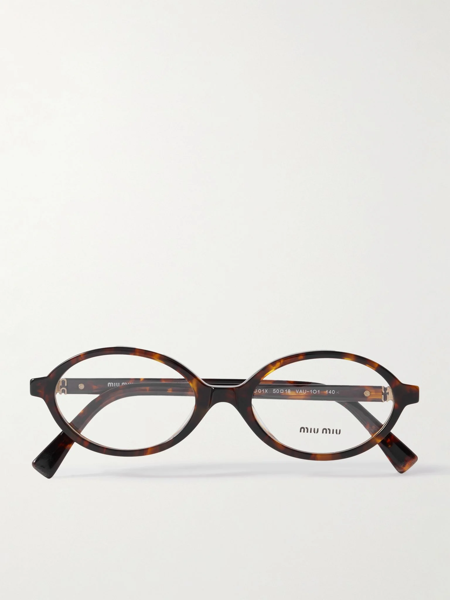 Miu Miu's glasses have a cool, minimal design with slim oval frames. They're made from tortoiseshell acetate and feature the vertical logo in gold-tone metal at the temples. Swap out the lenses for your prescription. Details & Care - Brown tortoiseshell acetate - Come with a case - Can be fitted with prescription or UV-protective lenses