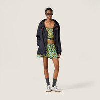 A sporty style is combined with sleek lines in this technical fabric blouson jacket. The Miu Miu logo completes the design with an iconic note. - Product code: ML1055_13MF_F0008_S_OOO - Long sleeves - Drawstring hood - Front zipper closure - Zipper pockets - Rubber logo - Imported - The model is 176 cm tall and wears a size 38 Height 74cm Materials Main material: 100% Recycled Polyester