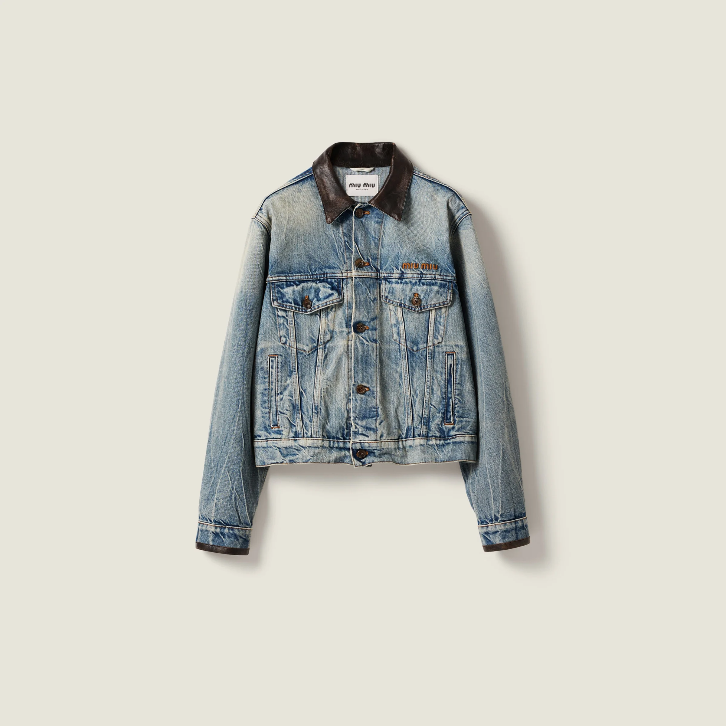 The authentic, aged look of this blouson jacket comes from constructed denim characterized by an intensive wash treatment and unique color. The leather collar and embroidered logo add character and charm, making the garment sophisticated and iconic. - Product code: GWB273_175S_F0076_S_OOO - Washed denim treatment - Classic fit - Unlined garment - Leather collar - Long sleeves, buttoned cuffs - Button closure - Contrasting top-stitching - Flapped pockets with button on the chest - Straight hem - Embroidered logo - Imported - The model is 181 cm tall and wears a size 38 Materials Main material: 100% Cotton