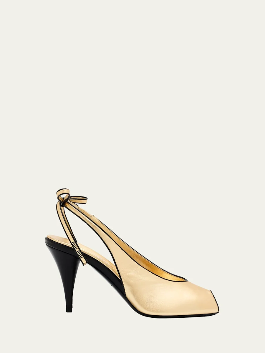 Miu Miu metallic leather pumps with contrast leather piping 3.25 in / 85 mm stiletto heel Peep toe Stretch slingback with adjustable ties Leather outsole Lining: Unlined Made in Italy Online Inquiries: BGS21_X6UHK| Store Inquiries: #4975425