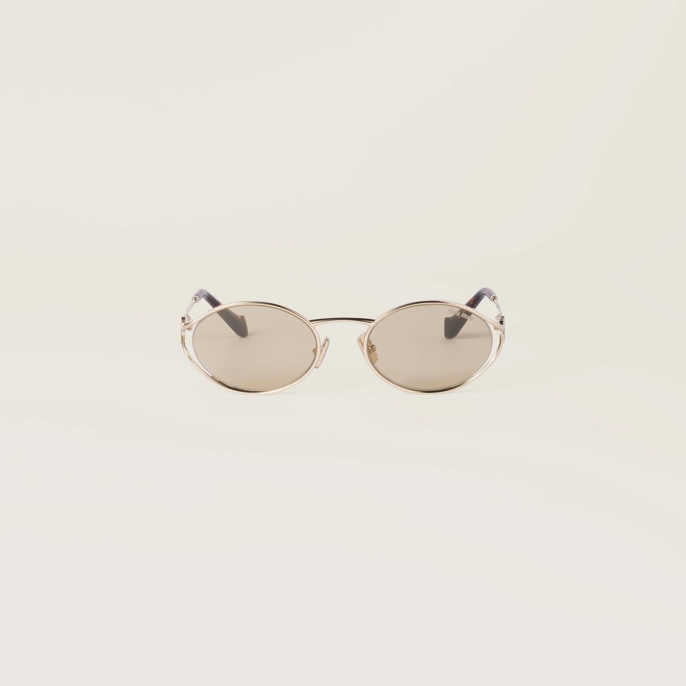 Metal sunglasses with sophisticated allure. The frame is emphasized by thin metal rims that separate from the trendy oval lenses before meeting up again with the new vertical Miu Miu logo integrated into the hinge of the straight temples. - Product code: SMU52Y_EZVN_FE10R_C_054 - Metal frame front - Color: Pale Gold - Frame not compatible with graduated lenses - 100% UVA / UVB protection - Adjustable nose pads suitable for any fit - Lens-nose-temple measurements: 54-21-125 mm - Article comes with dedicated packaging - Other colors available - Imported Materials Main material: Metal