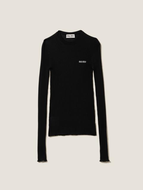 A casual yet refined style characterizes this cashmere and silk sweater. The slim fit and ribbed knit create a silhouette with effortless femininity, while the intarsia logo in a contrasting color completes the look with an iconic note. - Product code: MML821_13KV_F0040_S_232 - Ribbed knit - Slim fit - Ribbed knit crew-neck - Semi-raglan shoulder - Long sleeves - Intarsia logo - Imported - The model is 180 cm tall and wears a size 38 Height 60cm Materials Main material: 30% Silk 70% Cashmere
