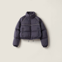 The down jacket, an iconic piece in the Miu Miu wardrobe, captures a rebellious, contemporary spirit. This slightly cropped version is inspired by the sporty piping seen on the runway and a relaxed, versatile attitude. - Product code: ML1309_158A_F0008_S_OOO - Oversized fit - Goose down padding - Stand-up collar - Raglan sleeves - Elasticized cuffs - Zipper closure - Zipper pockets - Elasticized drawstring hem - Knit logo patch - Imported - The model is 177 cm tall and wears a size 38 Height 55cm Materials Main material: 100% Recycled Polyester