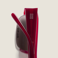 The eyewear from the FW25 Fashion Show, inspired by the early 2000s, combines the design of the narrow, rectangular frame with chunky temples. The lenses are decorated with the Miu Miu logo, a bold and glamorous touch that recalls the instinct to wear them immediately. - Product code: SMUB07_E21I_FE80Q_C_051 - Acetate frame front - Color: Opaline Burgundy - Frame compatible with graduated lenses - 100% UVA / UVB protection - Standard fit - Lens-nose-temple measurements: 51-17-140 mm - Article comes with dedicated packaging - Imported Materials Main material: Acetate
