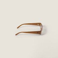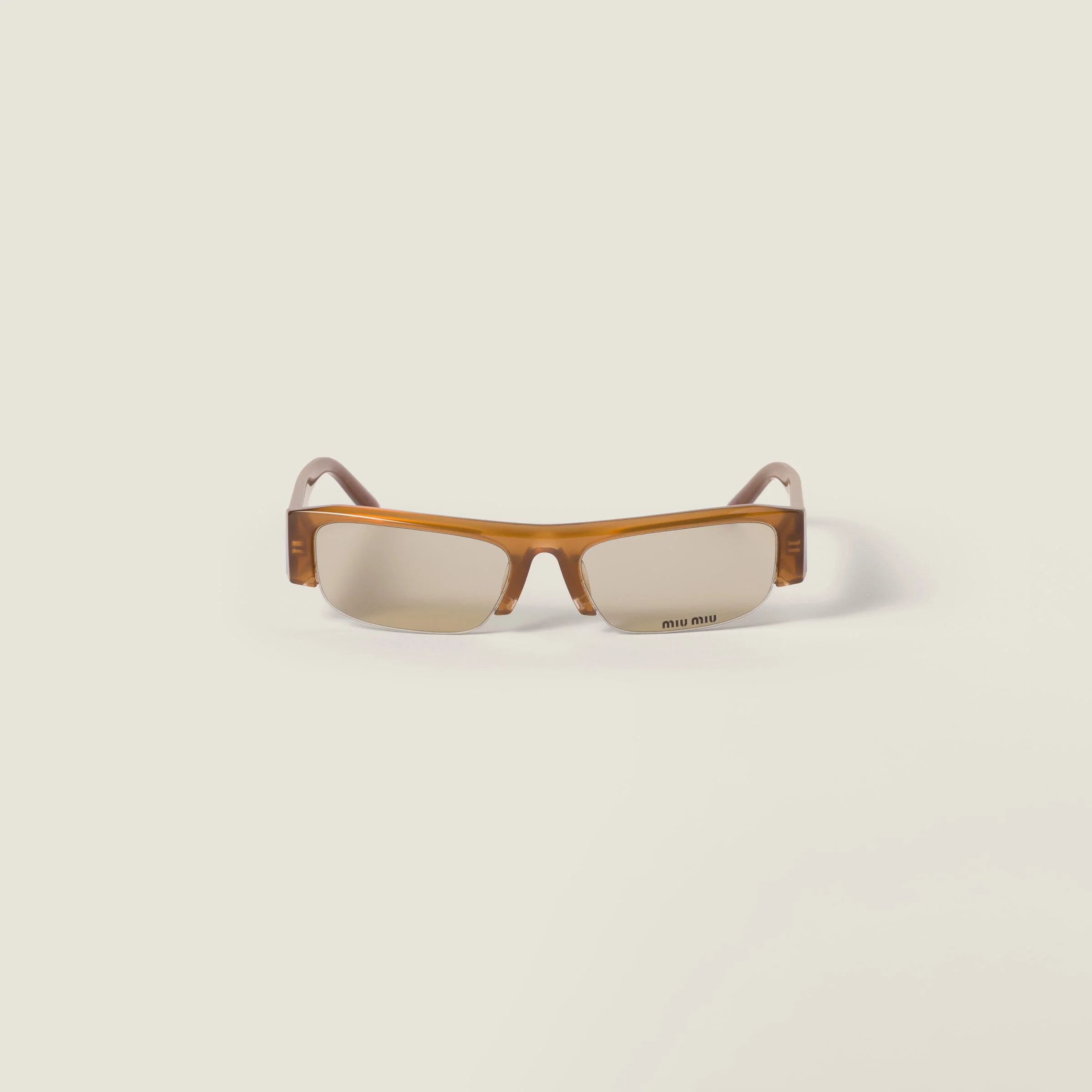 The eyewear from the FW25 Fashion Show, inspired by the early 2000s, combines the design of the narrow, rectangular frame with chunky temples. The lenses are decorated with the Miu Miu logo, a bold and glamorous touch that recalls the instinct to wear them immediately. - Product code: SMUB07_E22I_FE10R_C_051 - Acetate frame front - Opaline Amber - Frame compatible with graduated lenses - 100% UVA / UVB protection - Standard fit - Lens-nose-temple measurements: 51-17-140 mm - Article comes with dedicated packaging - Imported Materials Main material: Acetate