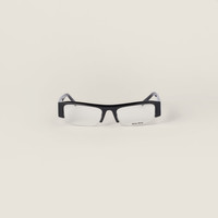 The eyewear from the FW25 Fashion Show, inspired by the early 2000s, combines the design of the narrow, rectangular frame with chunky temples. The lenses are decorated with the Miu Miu logo, a bold and glamorous touch that immediately makes you want to wear them. - Product code: SMUB07_S16K_FE08N_C_051 - Recycled bio-acetate frame front - Color: Black - Frame compatible with graduated lenses - 100% UVA / UVB protection - Blue Light lenses without prescription have a special filter to reduce exposure to the blue light of digital devices and sunlight - Standard fit - Lens-nose-temple measurement: 51-17-140 mm - Article comes with dedicated packaging - Imported Materials Main material: Acetate