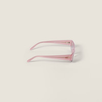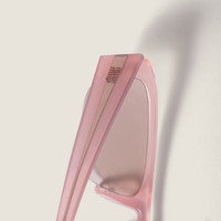 The eyewear from the FW25 Fashion Show, inspired by the early 2000s, combines the design of the narrow, rectangular frame with chunky temples. The lenses are decorated with the Miu Miu logo, a bold and glamorous touch that recalls the instinct to wear them immediately. - Product code: SMUB07_E20I_FE60V_C_051 - Acetate frame front - Color: Pale Opaline Pink - Frame compatible with graduated lenses - 100% UVA / UVB protection - Standard Fit - Lens-nose-temple measurement: 51-17-140 mm - Article comes with dedicated packaging - Imported Materials Main material: Acetate