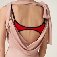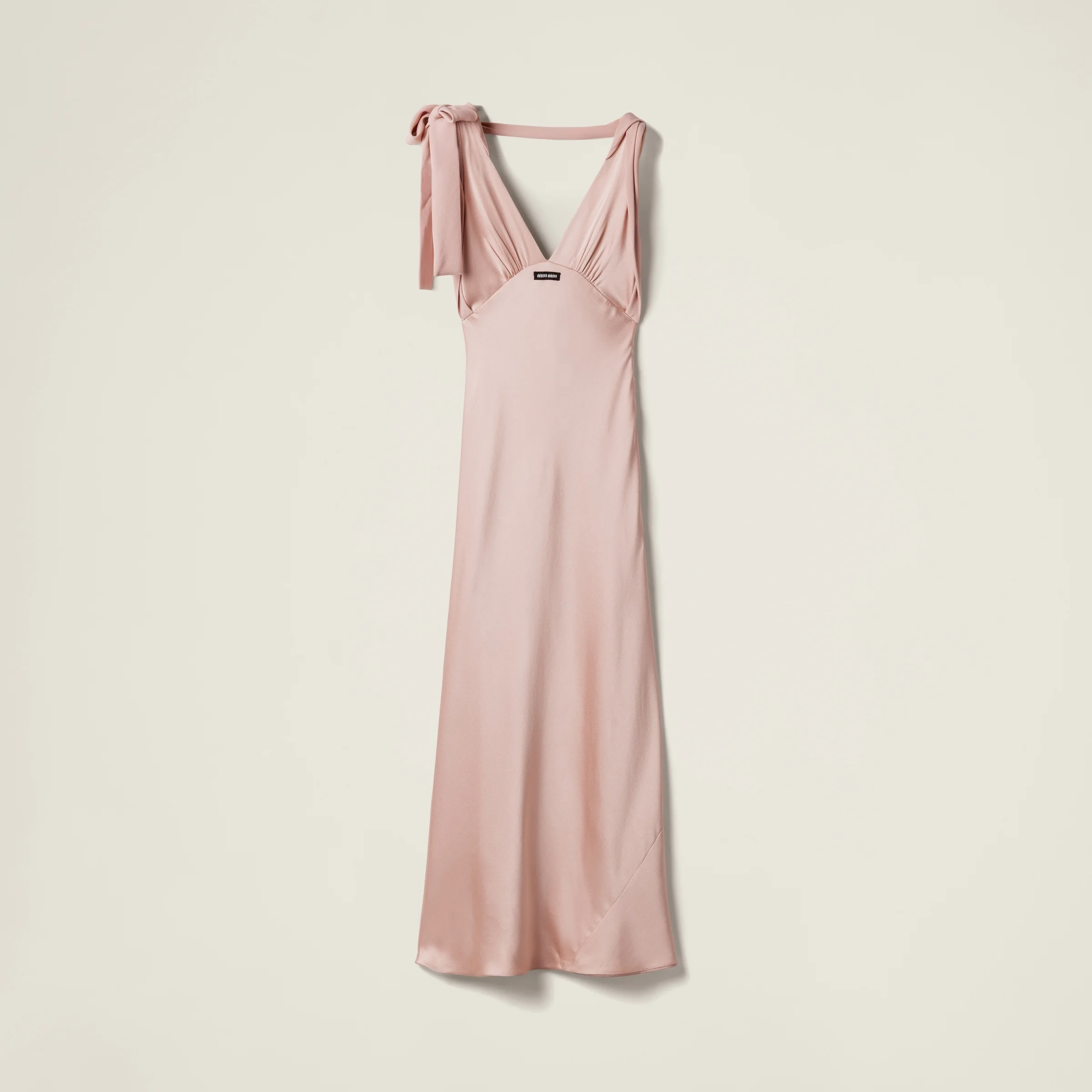 Sinuous draping, inspired by the runway show, adds femininity to the line of this dress that, thanks to lustrous satin and the plunging neckline with bow, makes summer evenings luxurious. - Product code: MF5894_1254_F0924_S_OOO - Flared fit - Lined garment - V-neck - Side zipper closure with hook - Knit logo label - Imported Height 140cm Materials Main material: 74% Acetate 26% Viscose