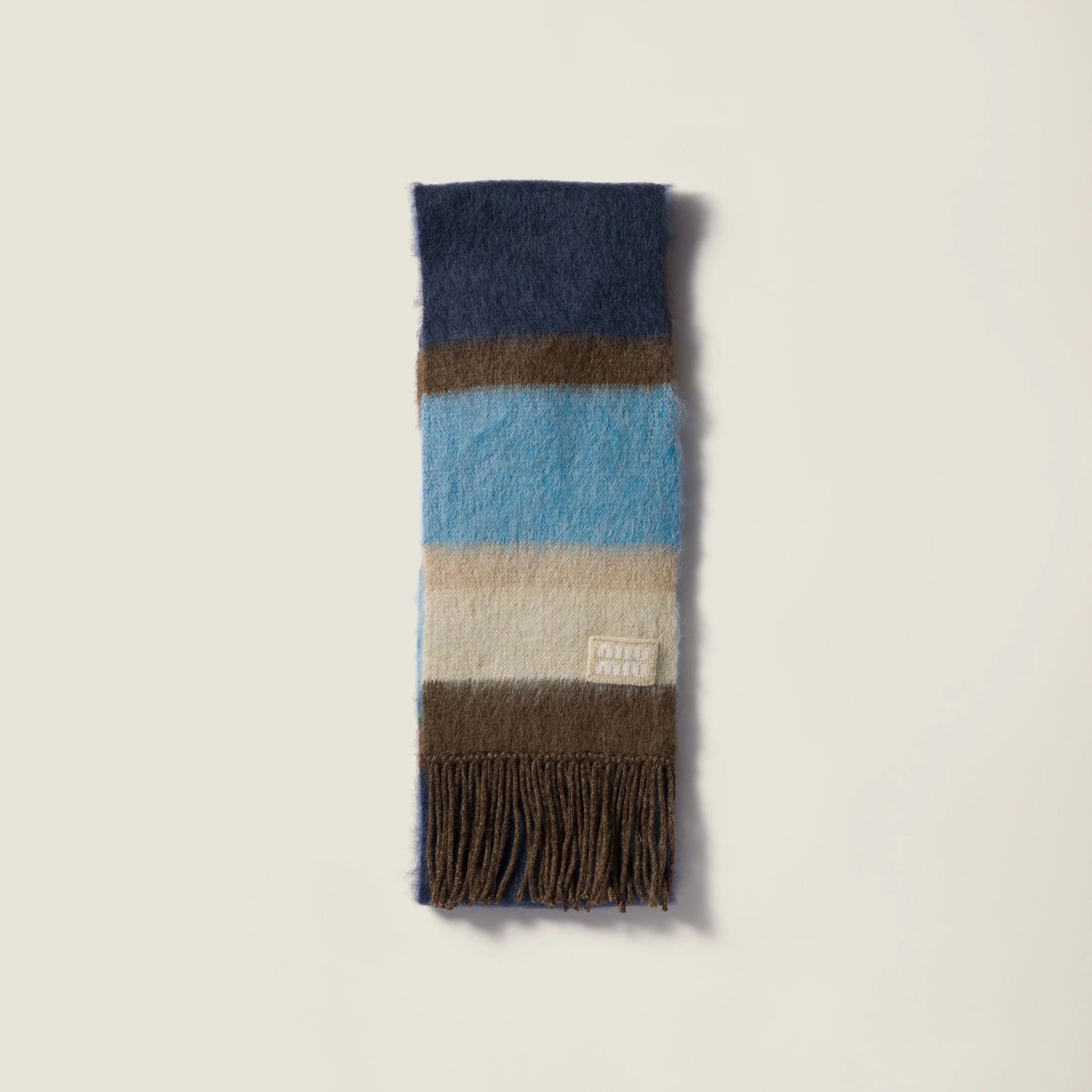 Soft wool blends with fine mohair to create a unique accessory. The playful striped pattern and fringed edges define the design of this scarf, which combines colors and textures. - Product code: 5FS094_2CVD_F04BD - Logo on label - Fringes on two sides - 67% mohair 30% polyamide 3% wool - Imported Height 23cm Width 185cm Materials Main material: Recycled Polyester