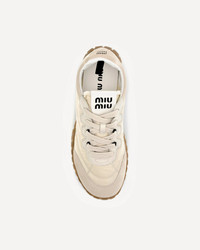 The Tyre Sneakers by Miu Miu combine technical materials and refined details in a dynamic, contemporary design. Made of technical fabric and suede, they feature lace-up lacing and fabric and leather lining for optimal comfort. Screen-printed logos appear on the tongue, diagonal and insole, while the EVA and rubber outsole with star tread ensures light weight and grip. The removable leather-covered footbed completes the model with functionality and sophistication. DETAILS - Sku: 5E417EF005ZJM_F0304 - Season: SS26 - Composition: UPPER 50% Recycled Polyamide 50% Calf Leather Bos Taurus SOLE 100% Rubber - MADE IN ITALY