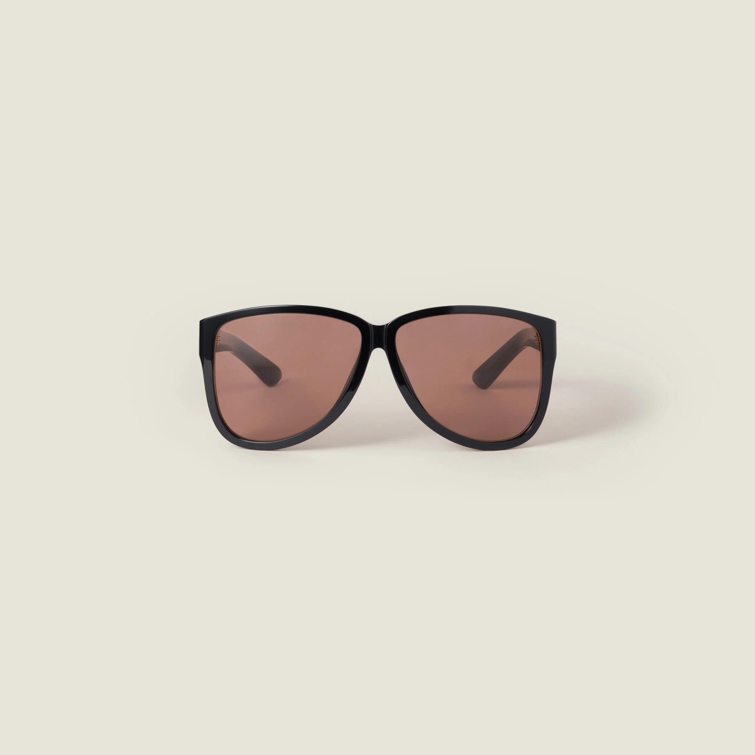 The oversized aesthetic of the Miu Ombre collection evolves in these sunglasses with a retro mood and important volumes. The style features a large pilot silhouette enhanced by the slim bridge. The temples are decorated with the gold-tone Miu Miu logo. - Product code: SMUA08_E16K_FE90Q_C_061 - Nylon frame front - Color: Black - Frame not compatible with graduated lenses - 100% UVA / UVB protection - Standard fit - Lens-nose-temple measurements: 61-12-140 mm - Article comes with dedicated packaging - Imported Materials Main material: Acetate