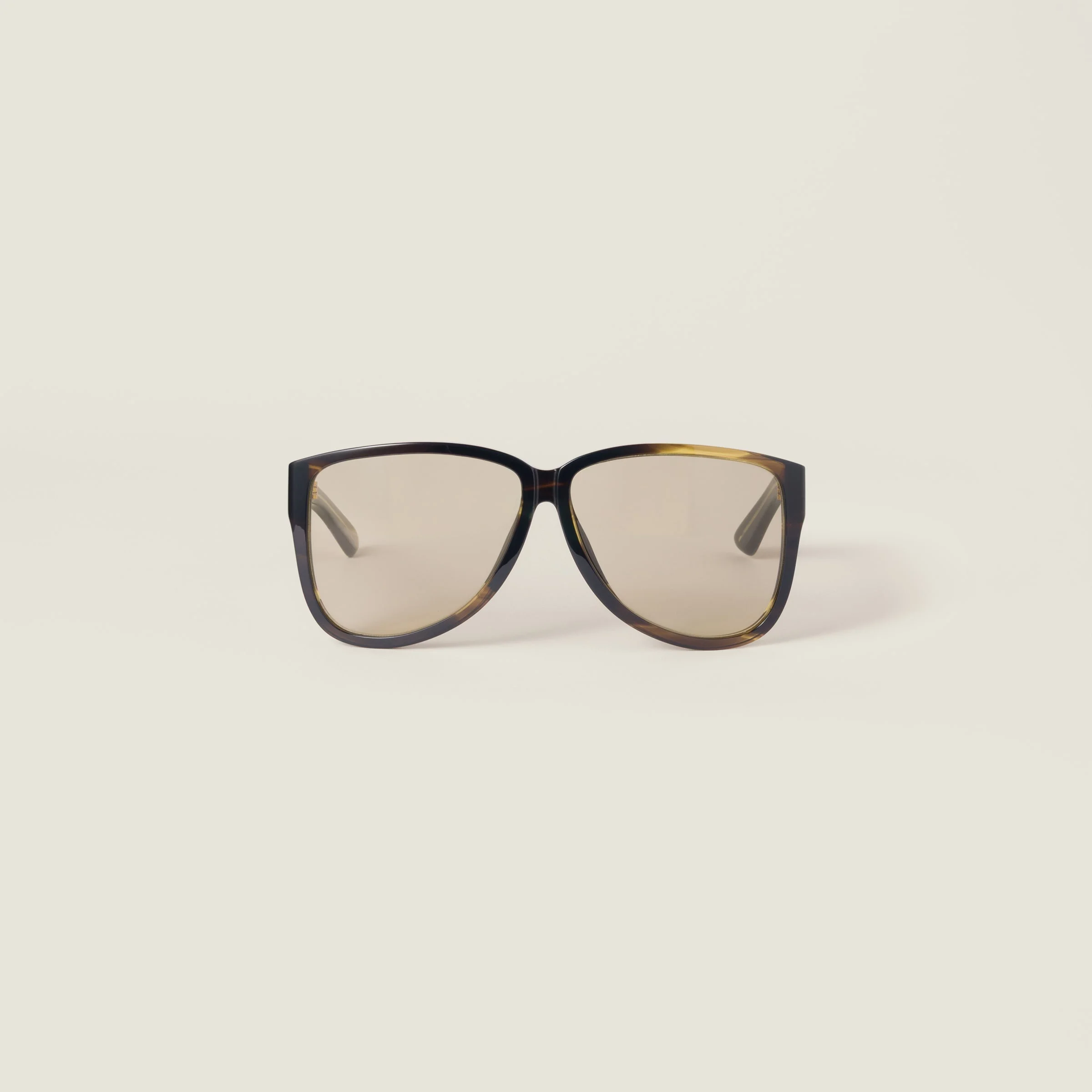 The oversized aesthetic of the Miu Ombre collection evolves in these sunglasses with a retro mood and important volumes. The style features a large pilot silhouette enhanced by the slim bridge. The temples are decorated with the gold-tone Miu Miu logo. - Product code: SMUA08_E25E_FE1OR_C_061 - Nylon frame front - Color: Streaked Loden Green - Frame not compatible with graduated lenses - 100% UVA / UVB protection - Standard fit - Lens-nose-temple measurement: 61-12-140 mm - Article comes with dedicated packaging - Imported Materials Main material: Acetate