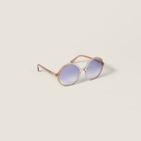 Miu Regard sunglasses are reinterpreted in a new oversized version with vintage allure. The acetate frame features a classic silhouette characterized by refined round lenses enhanced by slim rims. The temples are embellished with the refined touch of the vertical Miu Miu logo. - Product code: SMUB02_E26G_FE80O_C_059 - Bio-acetate frame front - Color: Gradient Brandy to Transparent - Frame compatible with graduated lenses - 100% UVA / UVB protection - Standard Fit - Lens-nose-temple measurement: 59-20-140 mm - Article comes with dedicated packaging - Imported Materials Main material: Acetate
