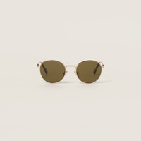Metal sunglasses with contemporary allure. The frame is emphasized by the slim metal rims that highlight the classic round design with a modern look. The vertical Miu Miu logo is integrated into the hinge of the straight temples. - Product code: SMU55Z_E5AK_FE09Z_C_050 - Metal frame front - Color: Gold - Frame compatible with graduated lenses - 100% UVA / UVB protection - Adjustable nose pads suitable for any fit - Lens-nose-temple measurements: 50-20-140 mm - Article comes with dedicated packaging - Other colors available - Imported Materials Main material: Metal
