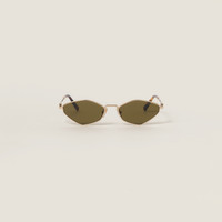 Metal sunglasses with a glamorous touch. The irregular front is outlined by refined thin rims and combined with sleek temples decorated with the iconic vertical Miu Miu logo. - Product code: SMU56Z_E5AK_FE09Z_C_056 - Metal frame front - Color: Gold - Frame compatible with graduated lenses - 100% UVA / UVB protection - Adjustable nose pads suitable for any fit - Lens-nose-temple measurements: 56-17-140 mm - Article comes with dedicated packaging - Other colors available - Imported Materials Main material: Metal