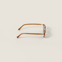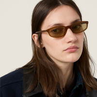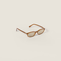Miu Regard sunglasses are reinterpreted in a new sophisticated, classic version. The frame has narrow rectangular lenses and slim rims that enhance its extreme lightness. The temples are embellished with the refined touch of the vertical Miu Miu logo. - Product code: SMUA06_E22I_FE10R_C_054 - Acetate frame front - Opaline Amber - Frame compatible with graduated lenses - 100% UVA / UVB protection - Standard fit - Lens-nose-temple measurements: 54-17-140 mm - Article comes with dedicated packaging - Imported Materials Main material: Acetate