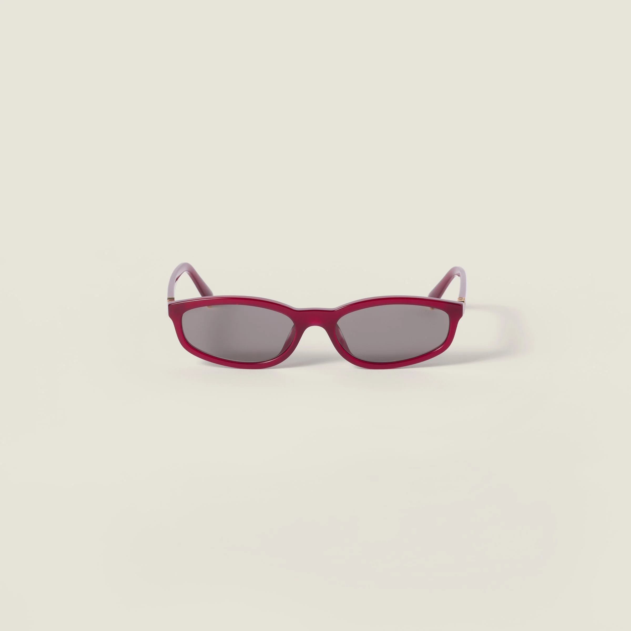 Miu Regard sunglasses are reinterpreted in a new sophisticated, classic version. The frame has narrow rectangular lenses and slim rims that enhance its extreme lightness. The temples are embellished with the refined touch of the vertical Miu Miu logo. - Product code: SMUA06_E21I_FE80Q_C_054 - Acetate frame front - Color: Opaline Burgundy - Frame compatible with graduated lenses - 100% UVA / UVB protection - Standard fit - Lens-nose-temple measurements: 54-17-140 mm - Article comes with dedicated packaging - Imported Materials Main material: Acetate