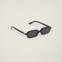 Acetate sunglasses with a sophisticated rectangular shape. The frame features thin rims and ultra-flat lenses that highlight the extreme lightness. The vertical Miu Miu logo adds its signature to the temples for a refined touch. - Product code: SMU11Z_E16K_F05S0_C_051 - Recycled bio-acetate frame - Color: Black - Frame not compatible with graduated lenses - 100% UVA / UVB protection - Standard fit - Lens-nose-temple measurement: 51-16-140 mm - Article comes with dedicated packaging - -Other colors available - Imported Materials Main material: Acetate