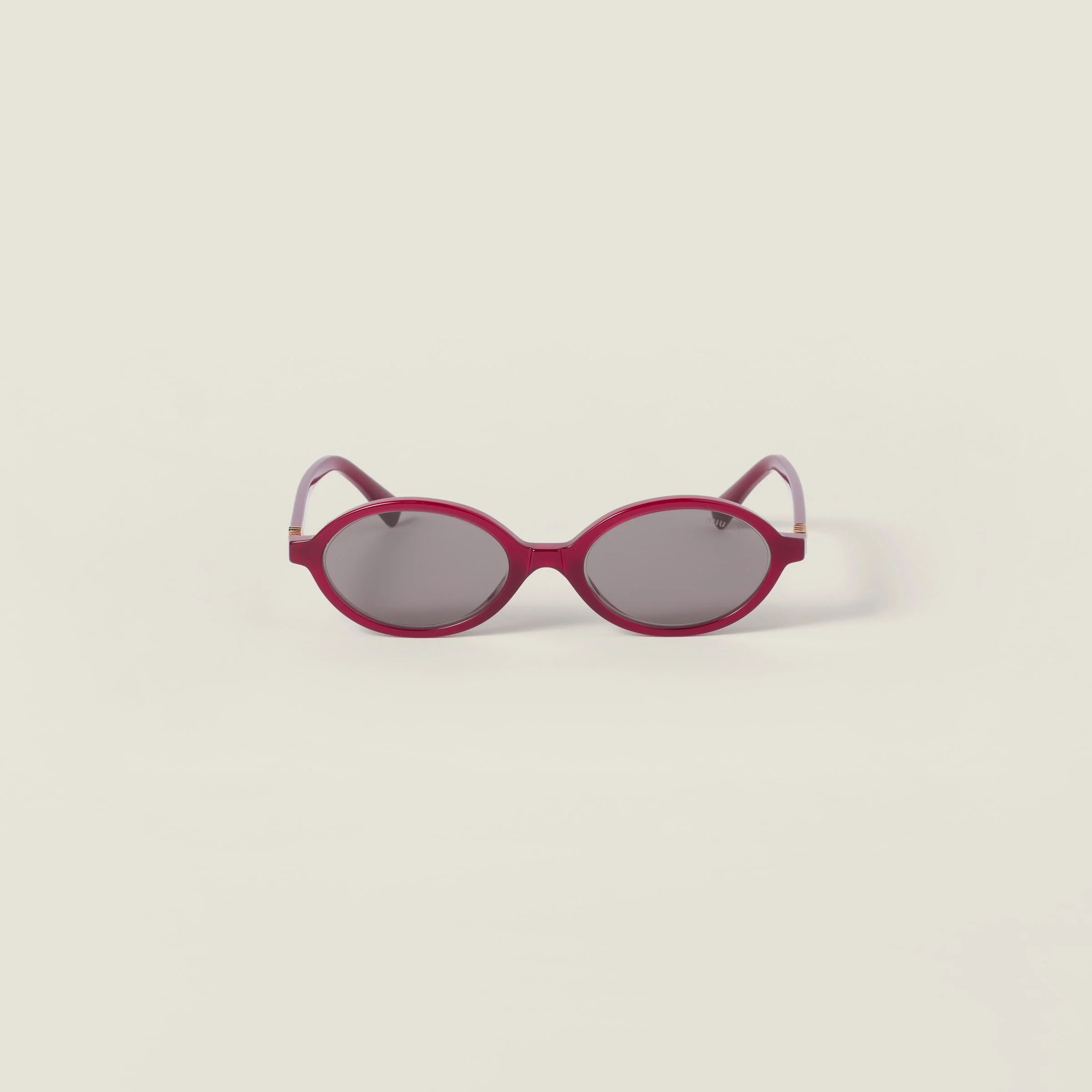 Acetate sunglasses with a sophisticated oval shape. The acetate frame features thin rims and ultra-flat lenses that emphasize extreme lightness. The vertical Miu Miu logo decorates the temples, adding a refined touch. - Product code: SMU04Z_E21I_FE80Q_C_050 - Acetate frame front - Color: Opaline Burgundy - Frame not compatible with graduated lenses - 100% UVA / UVB protection - Standard fit - Lens-nose-temple measurements: 50-18-140 mm - Article comes with dedicated packaging - Imported Materials Main material: Acetate