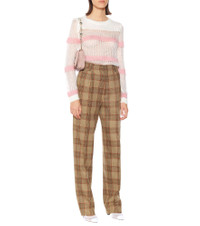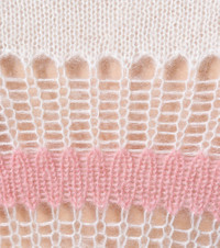 A pastel palette of "Talco" white and "Petalo" pink bring a quintessentially Miu Miu mood to this open-knit sweater. Crafted in Italy from mohair and wool-blend yarns, the design has an opaque yoke with a crew neckline, contrasted by a sheer bodice and sleeves. Product Details - Material: 67% mohair, 29% polyamide, 4% wool - Care instructions: dry clean - Made in Italy - Designer color name: Talco + Petalo - Item number: P00405898 Size & Fit - True to size - Semi-sheer - Designed for a loose fit - Falls to the hip - The model seen in the picture is 178cm-5'10" and wearing a size IT 40