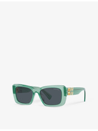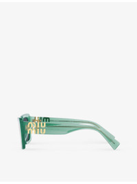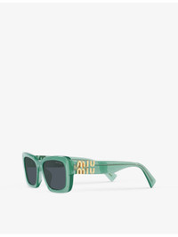 PRODUCT DETAILS - Miu Miu acetate sunglasses - Frame 100% acetate; lens 100% polyamide - Style number: MU 07YS - Polished frame, semi-transparent frame, gold-toned vertical logos at temples, logo at lens, 100% UV/UVB protected - Frame shape: rectangular - Dimensions: lens height 53 mm, bridge size 18 cm, temple length 135 mm - Wipe with a clean, dry cloth - Comes with a hard case and cloth