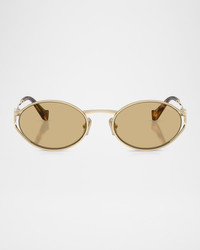 - Miu Miu "MU 52YS" rimmed sunglasses feature a simple and elegant oval silhouette - Eye/bridge/temple (in mm): 54-21-125mm - Monochromatic lenses - Adjustable nose pads - Gold-tone logo on temples - Thin, tapered arms - Capped earpieces - 100% UVA/UVB protection - Metal - Spot clean - Made in Italy - Proposition 65 warning for California residents