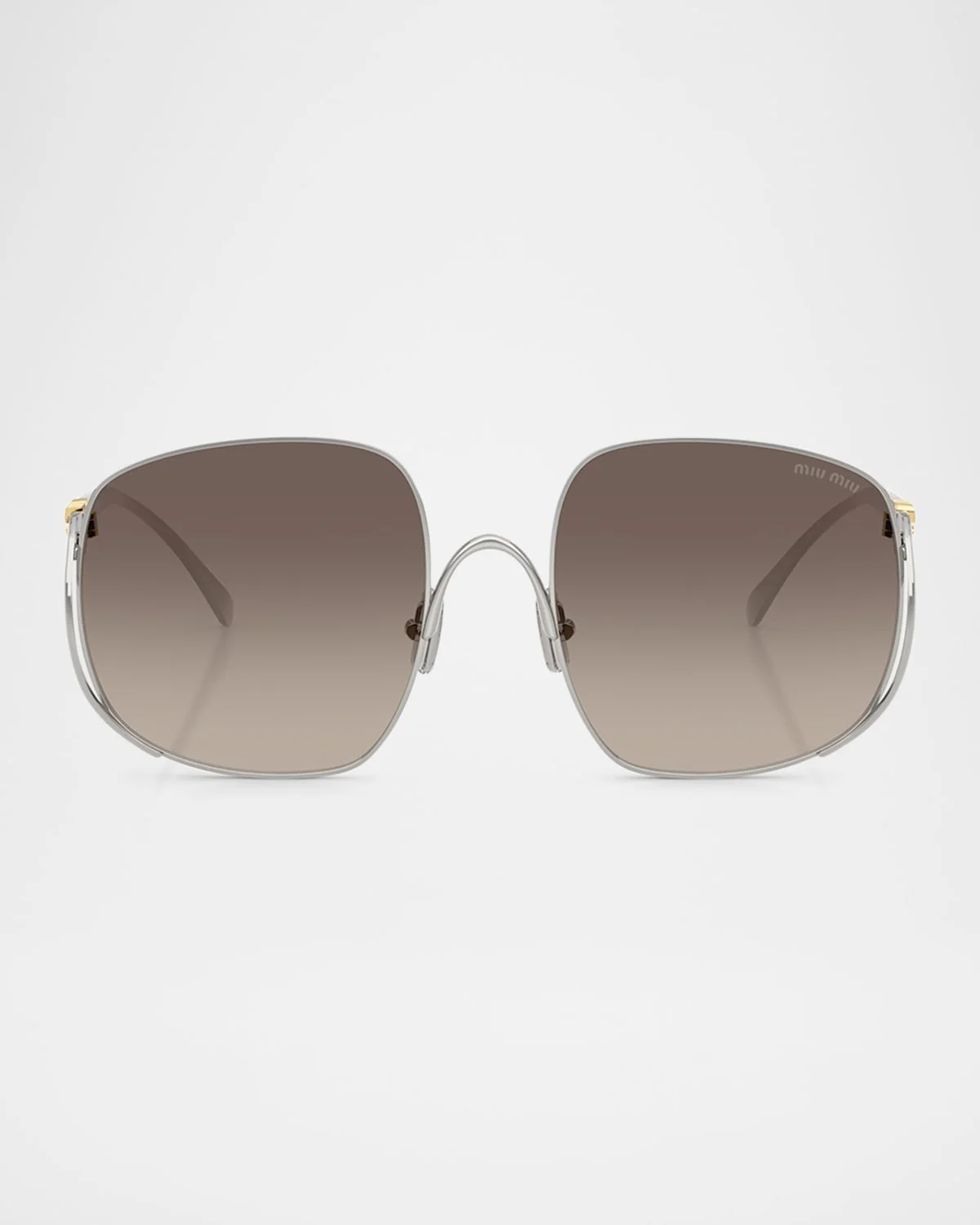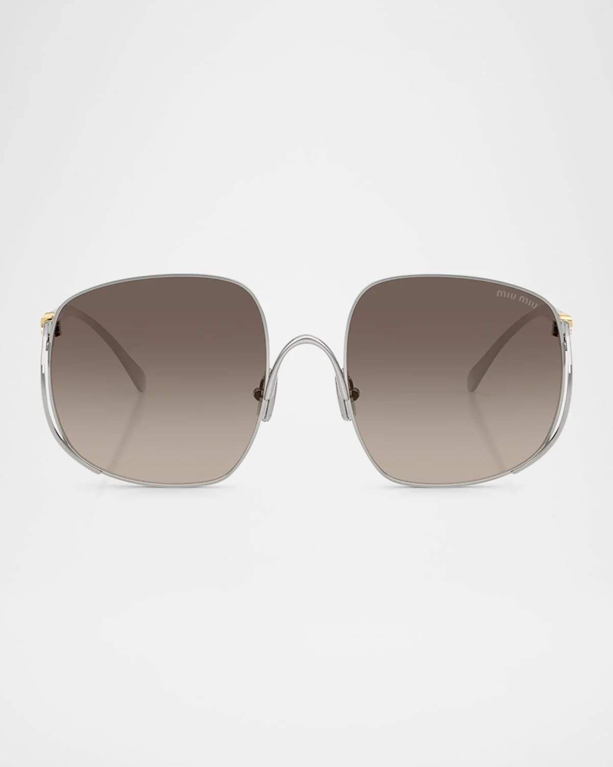 Miu Miu sunglasses embody feminine elegance with a modern twist, featuring oversized square lenses framed in sleek, lightweight metal. The airy construction is elevated by sculptural curves and delicate detailing, offering a sophisticated yet playful statement Eye/bridge/temple (in mm): 5720140 Gradient lenses Adjustable nose pads Vertical logo on temples Thin, tapered arms 100% UVA/UVB protection Metal/plastic Spot clean Made in Italy