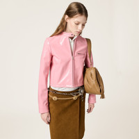 The dynamic lines of this zipper jacket are enhanced by the sheen of soft naplak leather, expressing sophisticated, bold, feminine style. - Product code: MPV935_ADNT_F0028_S_OOO - Regular fit - Lined garment - Front zipper closure with snap - Stand-up collar - Straight sleeves and shirt-style cuffs with snap closure - Welt zipper pockets - Embossed lettering logo - Imported - The model is 177 cm tall and wears a size 38 Height 48cm Materials Main material: Lambskin