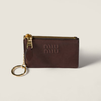 The fine touch of nappa leather and the iconic Miu Miu logo enrich the simple lines of this card holder. The zipper pocket and key ring detail complete the design, combining functionality and character. - Product code: 5MC093_AEFX_F0NBL - Three card slots - Zipper closure - With removable metal key ring - Moire and nappa leather lining - Embossed lettering logo - Imported Height 8cm Width 11cm Materials Main material: Lambskin