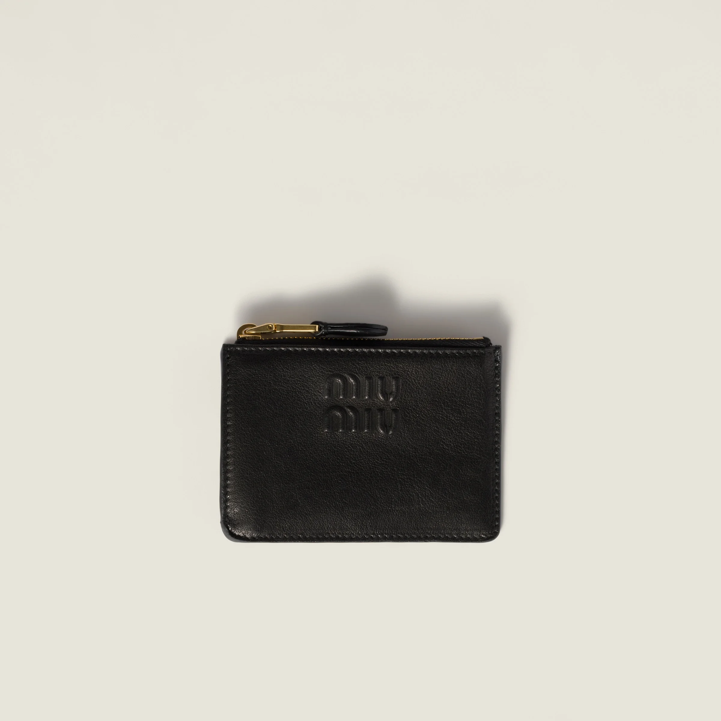 The fine touch of nappa leather and the iconic Miu Miu logo enrich the simple lines of this card holder. The zipper pocket and key ring detail complete the design, combining functionality and character. - Product code: 5MC093_AEFX_F0002 - Three card slots - Zipper closure - With removable metal key ring - Moire and nappa leather lining - Embossed lettering logo - Imported Height 8cm Width 11cm Materials Main material: Lambskin