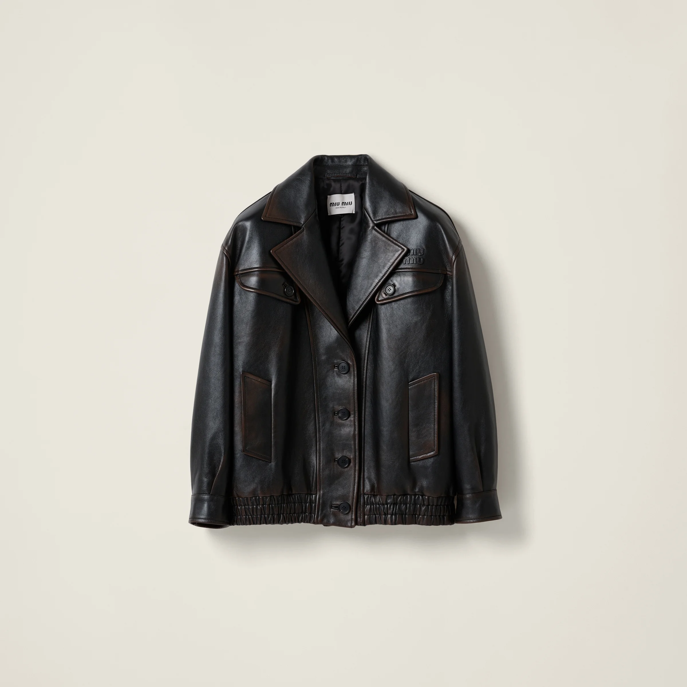 Miu Miu's experimentation with vintage is expressed in the lines of this jacket, in which the aged treatment of nappa leather enhances its iconic essence and style. - Product code: MPV921_1134_F0AL3_S_OOO - Regular fit - Vintage treatment - Lined garment - Padded with wadding - Notch lapels - Front button closure - Straight sleeves with shirt-style cuffs - Wide-welt pockets - Elasticized hem - Embossed lettering logo - Imported - The model is 176 cm tall and wears a size 30 Height 68cm Materials Main material: Lambskin