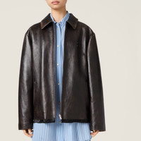 Masculine lines meet soft nappa leather in this jacket with a vintage treatment that enhances the iconic details of the tonal stitched logo and raw-cut hem, a symbol of Miu Miu's experimental vision. - Product code: MPV953_1134_F0201_S_OOO - Regular fit - Vintage treatment - Straight sleeve - Quilted lining padded with wadding - Front zipper closure - Shirt-style collar - Welt zipper pockets - Embossed lettering logo - Imported - The model is 176 cm tall and wears a size 38 Materials Main material: Lambskin
