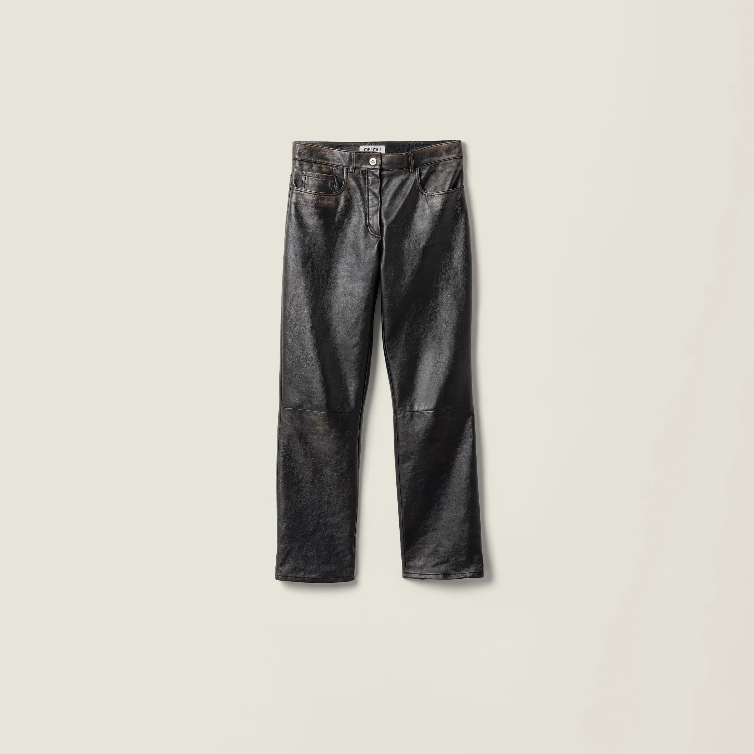These menswear-inspired pants are made of soft nappa leather that has undergone a special aged treatment that gives the garment vintage allure, enhancing the color and relaxed fit. - Product code: MPP403_1134_F0002_S_OOO - Regular fit - Vintage treatment - Five pockets - Lined garment - Zipper fly with tack button - Waistband with belt loops - Embossed lettering logo - Imported - The model is 180 cm tall and wears a size 38 Height 40cm Materials Main material: Lambskin