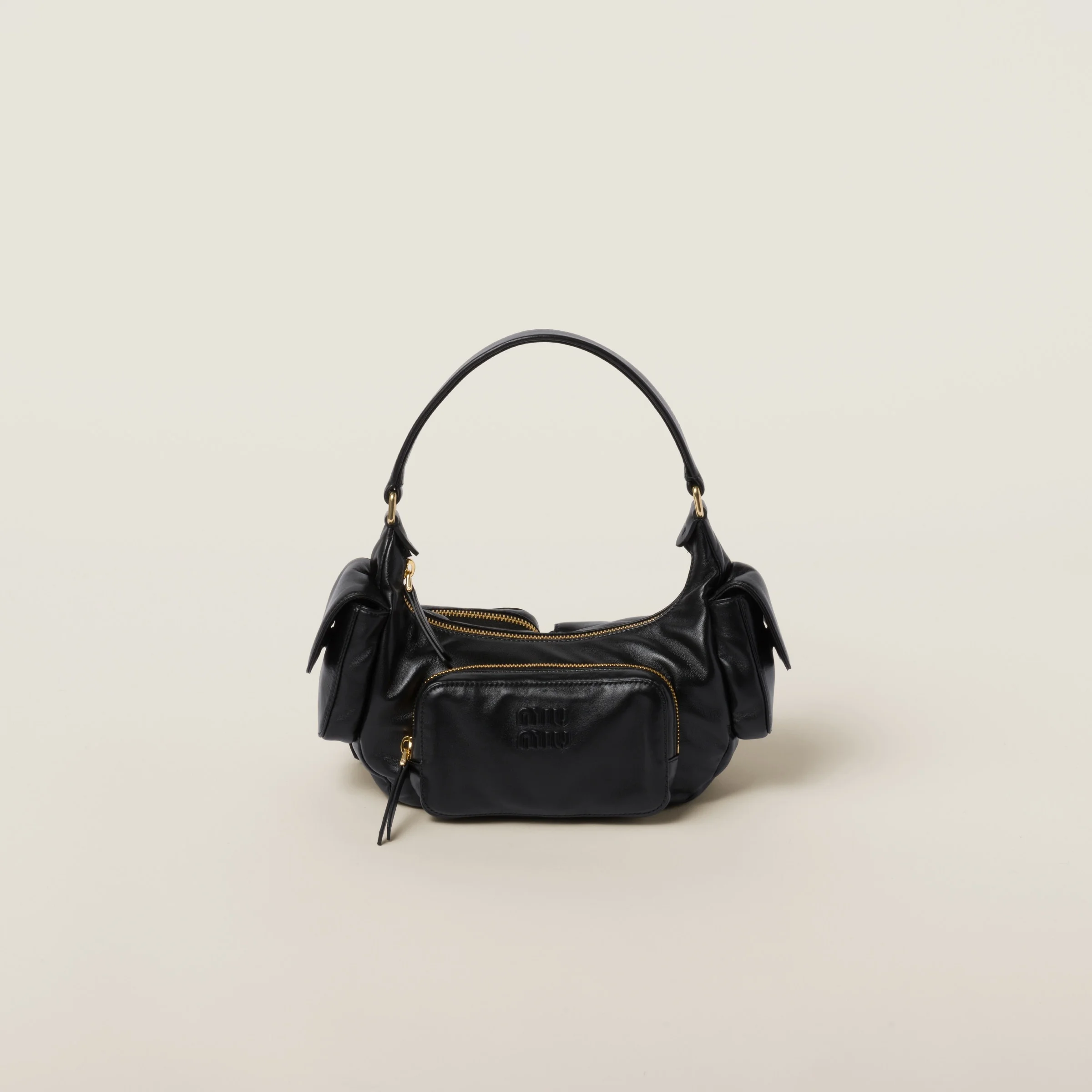 This nappa leather Pocket bag is characterized by an extremely contemporary, cosmopolitan, and captivating design. The multiple pockets border between function and decoration, while the lettering logo adds an iconic and distinctive note. The gold-tone hardware completes the design with shiny touches. - Product code: 5BC146_2F8N_F0002_V_OOO - Leather handle - Pockets on front and back - Gold-tone hardware - Embossed lettering logo - Zipper closure - Cotton satin lining with zipper pocket - Imported Height 12cm Width 21cm Length 6cm Materials Main material: Lambskin
