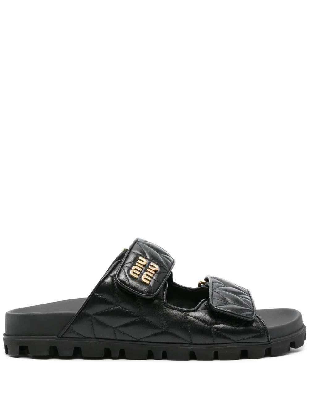 matelasse leather sandals Highlights - Black - Calf leather - Matelasse effect - Open toe - Logo lettering - Moulded footbed - Rubber lug sole - Gold-tone hardware - Front touch-strap fastening - Slip-on style Composition Leather 100% SIZE & FIT Measurement HEEL 0.98 in(2.5 cm)