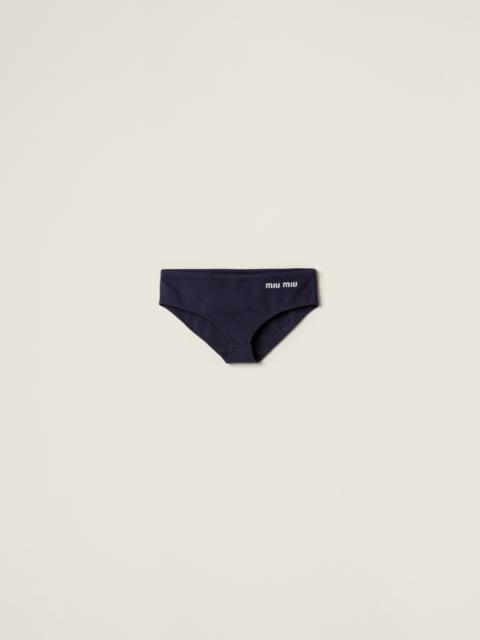 This swimsuit, among the protagonists of the SS24 show, was designed to become an integral part of the looks. The embroidered logo completes the design with an iconic note. - Product code: MMP248_14SJ_F0008_S_OOO - Embroidered logo - Interlock knit - Imported - The model is 180 cm tall and wears a size 38 Height 22cm Materials Main material: 100% Recycled Polyamide