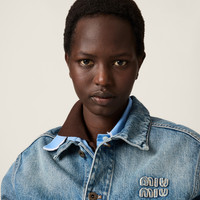 Stonewashed denim with a '90s mood is combined with raw-cut details and cornflower blue poplin inserts, typical of Miu Miu's language, giving this loose-fit trucker jacket an experimental, vintage twist. - Product code: GWB247_16T1_F0013_S_OOO - Washed denim treatment - Unlined garment - Loose fit - Shirt-style collar - Long sleeves, buttoned cuffs - Button closure - Contrasting stitching - Flapped pockets with buttons on the chest - Raw-cut hem - Embroidered logo - Center-back length 48cm, Size: 38 - Imported - The model is 179 cm tall and wears a size 38 Height 49cm Materials Main material: 100% Cotton