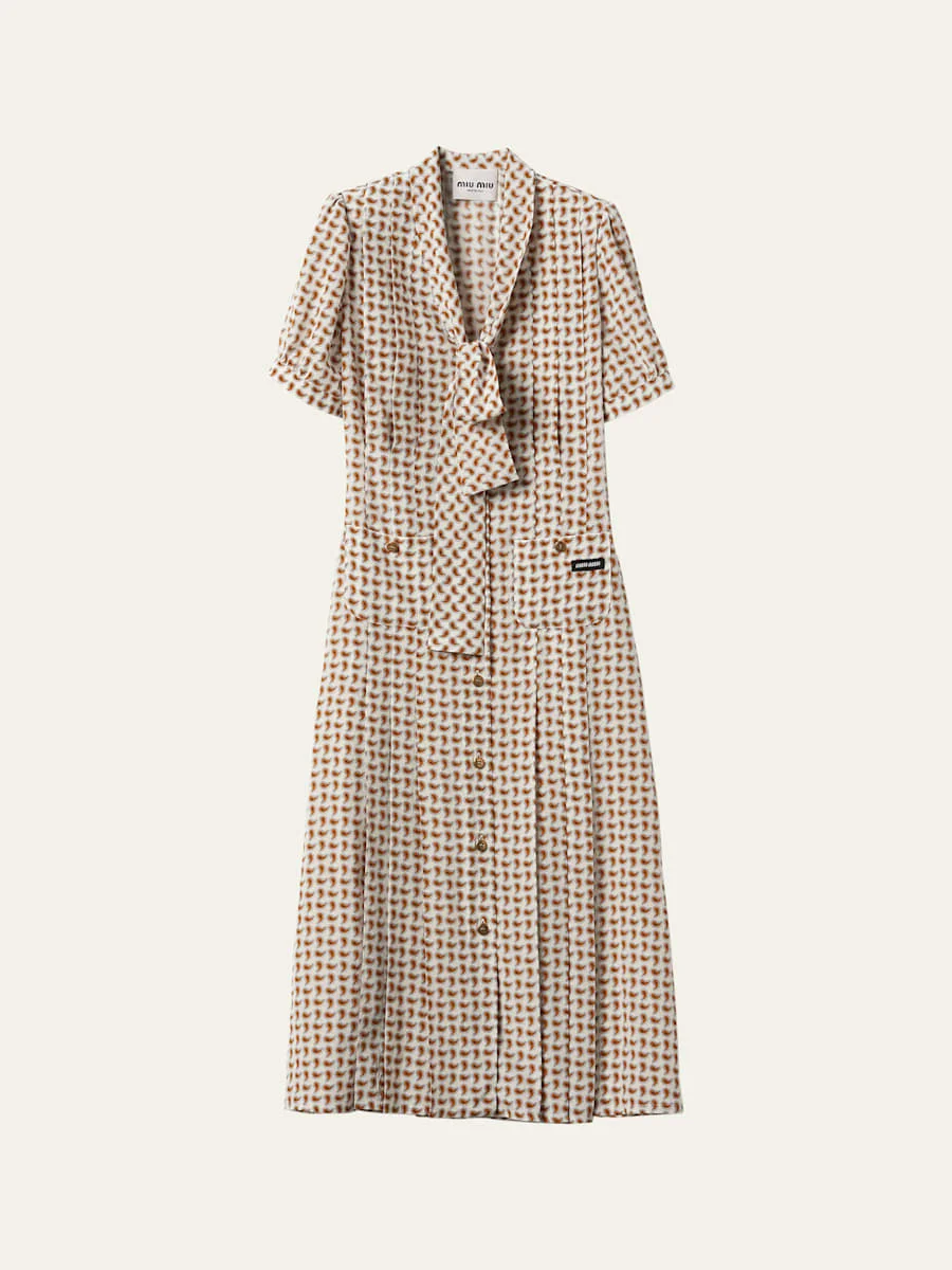 Miu Miu midi shirtdress in an allover paisley print featuring a tie neckline Spread collar Button closure Short sleeves Front patch pockets Hem falls below the knee Aline silhouette Silk Made in Italy