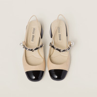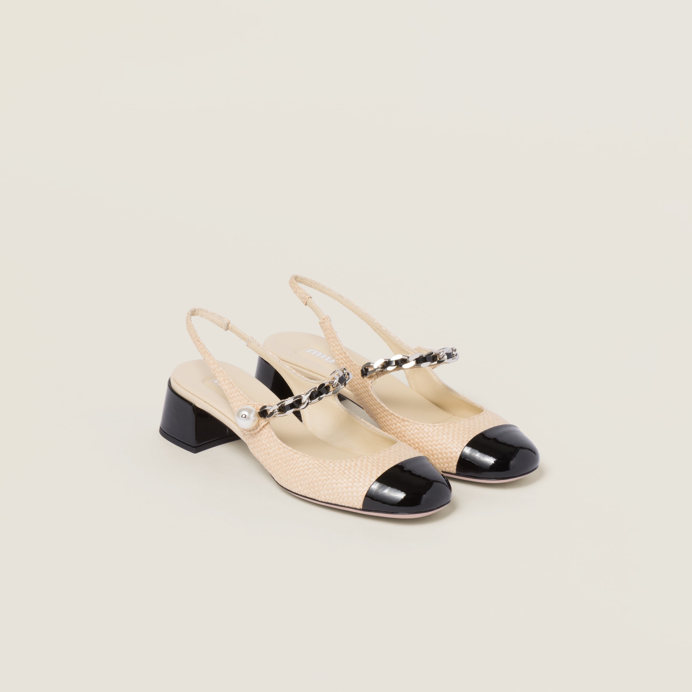 Playing with classic taste, Miu Miu presents a new version of the slingback pump. This refined version made of raffia and patent leather expresses a sophisticated yet rebellious character. The charming metal chain is combined with the pearl that evokes traditional style and the structured heel with a retro mood. Thanks to its design, the shoe enters a woman's wardrobe, subverting conventional rules. - Product code: 5I045E_3LOP_F0I55_F_035 - Upper with strap embellished with a metal chain and artificial pearl - Screen-printed logo - Leather sole - Imported